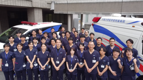阪大病院高度救命救急センター前で今年度の仲間との集合写真です。よろしくお願いします。